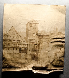 La lumière rasante permet au restaurateur de documenter les modifications dans la planéité d’une photographie. Dans ce cas, nous pouvons voir les plis du bord inférieur, mais également le gondolement créé par le papier gommé de renfort au dos du tirage.