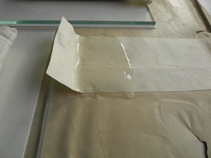 L’utilisation d’un cataplasme permet au restaurateur d’appliquer de l’eau ou un solvant de manière lente et contrôlée afin d’éviter un changement brutal pour la photographie.