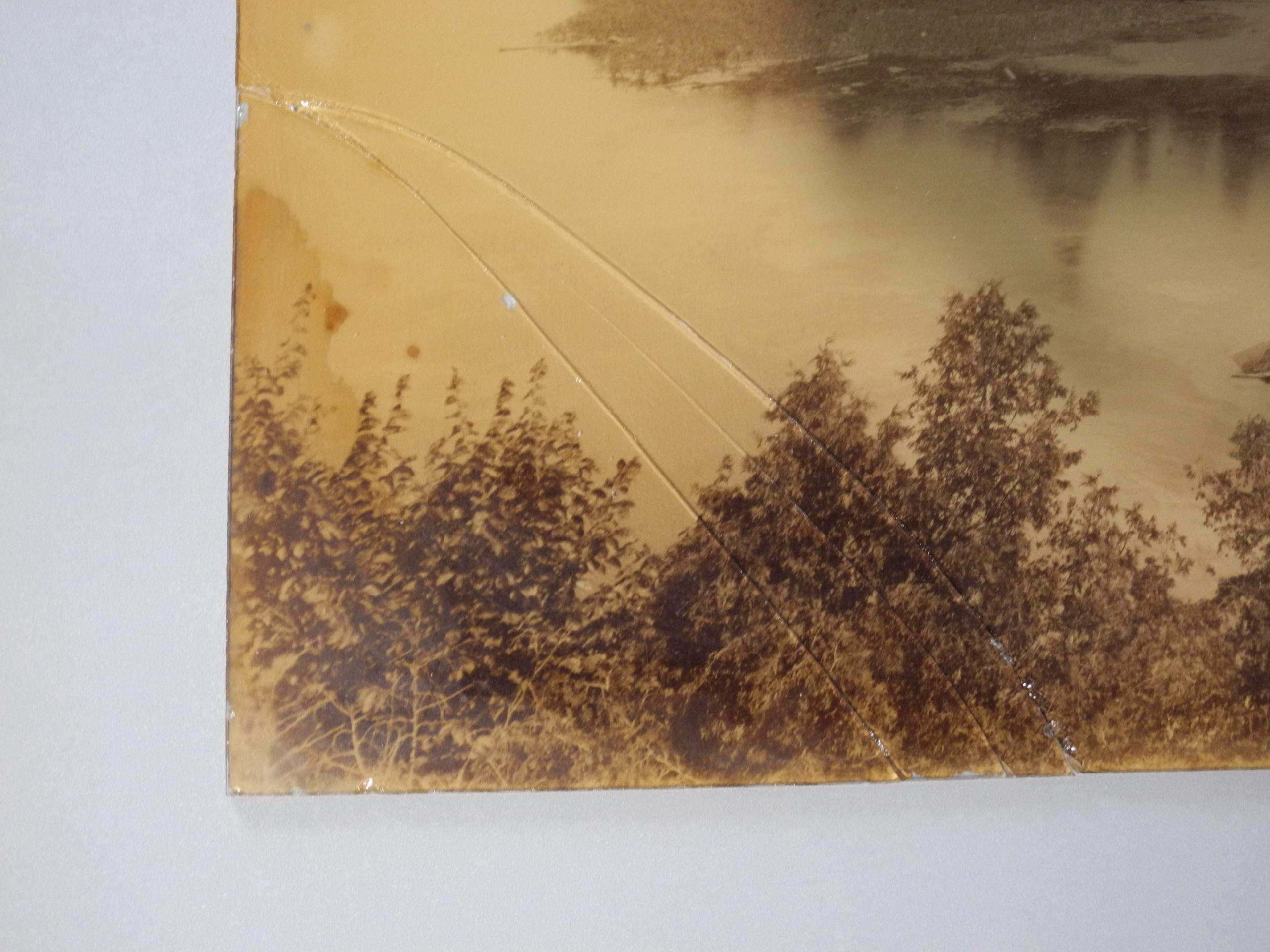 Documentation préalable au traitement de conservation-restauration d'un tirage albuminé monté sous verre. Détail du coin inférieur gauche, recto.