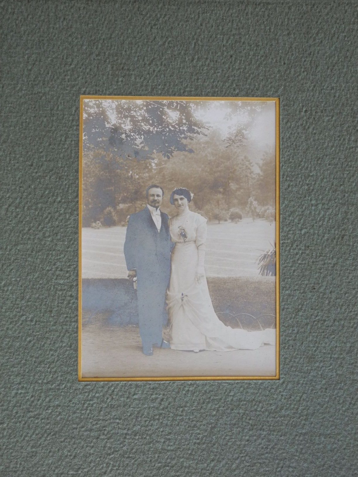 Une photographie gélatino-argentique montée sous une fenêtre de passe-partout en carton vert forêt texturé, avec un bord doré le long de la fenêtre. La photographie représente la un couple de marié, l’homme porte un costume et la femme porte une robe blanche, ils sont debout devant une pelouse. Le tirage présente un fort affaiblissement, jaunissement et miroir d’argent.