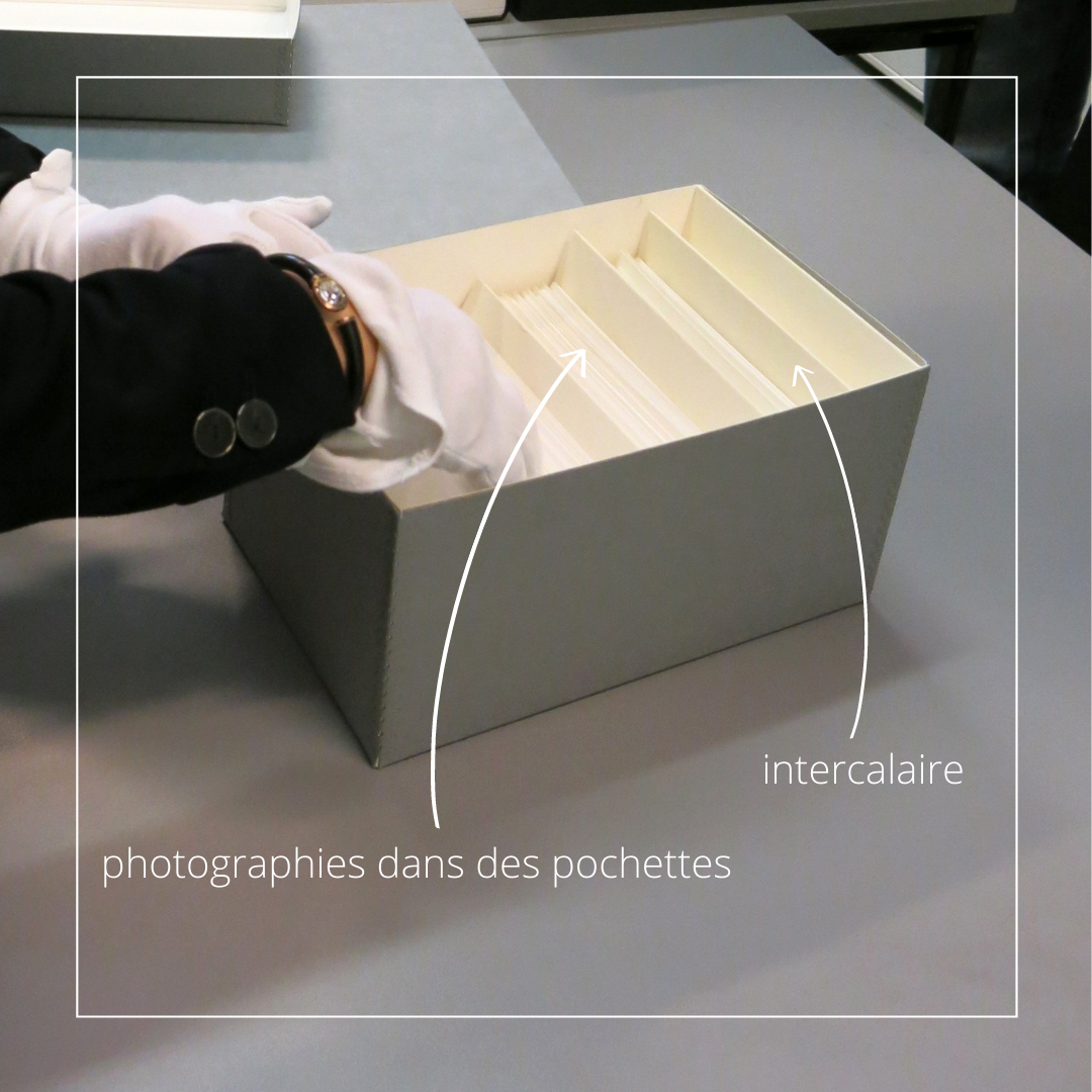 L’image montre une boîte de conservation contenant des photographies stockées dans des pochettes de conservation, placées verticalement dans la boîte. Les pochettes sont séparées par des intercalaires en carton de conservation tous les 5 à 10 cm. Des mains portant des gants de coton blanc sont en train de manipuler les pochettes dans la boîte.
